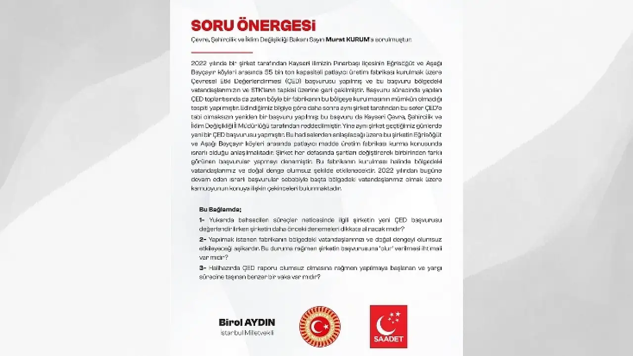 Önergede, 2022 yılında Kayseri'nin Pınarbaşı ilçesine bağlı Eğrisöğüt ve Aşağı Beyçayır köyleri arasında 55 bin ton kapasiteli bir patlayıcı üretim fabrikası kurulması amacıyla yapılan Çevresel Etki Değerlendirmesi (ÇED) başvurusunun, bölge halkı ve sivil toplum kuruluşlarının tepkileri üzerine geri çekildiği hatırlatıldı.