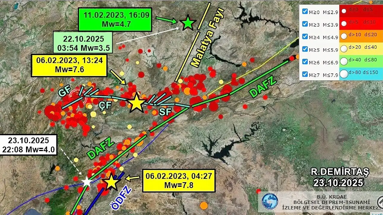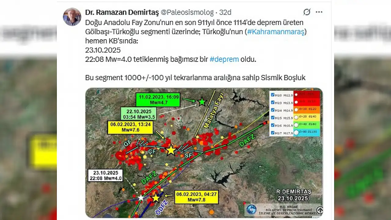 Deprem uzmanı Dr. Ramazan Demirtaş, sosyal medya hesabından yaptığı açıklamada, “Doğu Anadolu Fay Zonu'nun en son 911 yıl önce deprem üreten Gölbaşı-Türkoğlu segmenti üzerinde bağımsız bir deprem tetiklendi. Bu segment 1000+/-100 yıl tekrarlanma aralığına sahip Sismik Boşluk" bilgisini paylaştı.