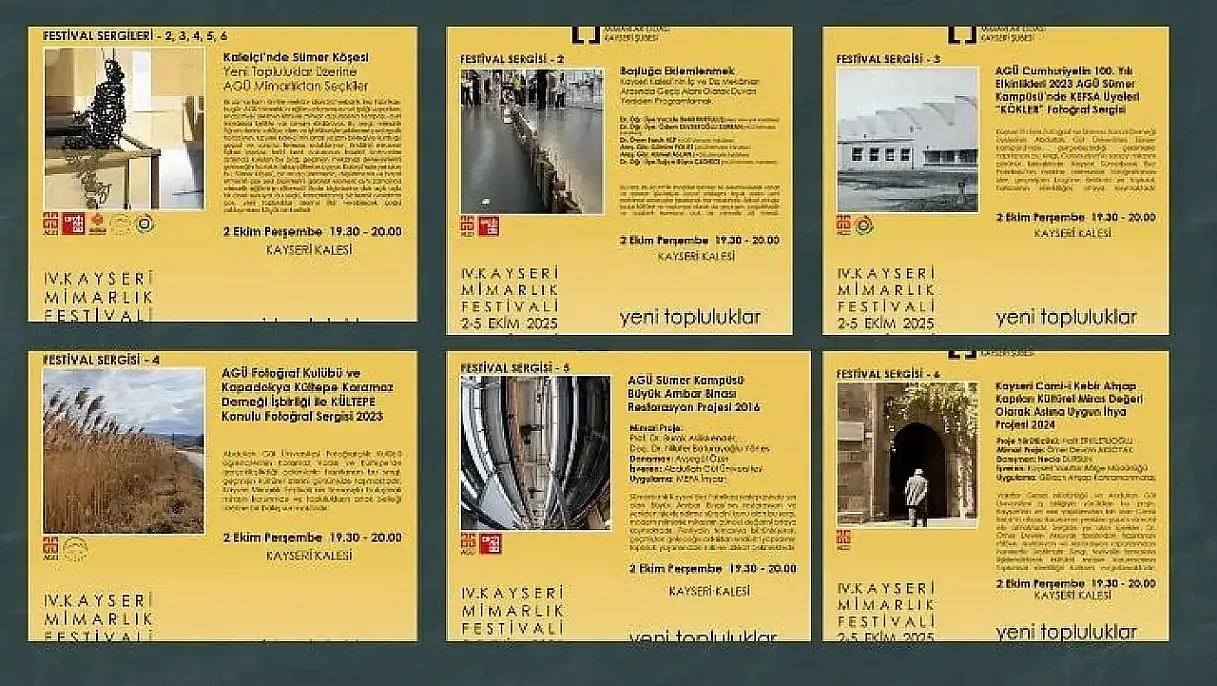 TMMOB Mimarlar Odası Kayseri Şubesi tarafından düzenlenen IV. Kayseri Mimarlık Festivali, bu yıl da kente kültür ve sanat dolu günler yaşatacak. 2-5 Ekim 2025 tarihleri arasında Kayseri Kalesi’nde gerçekleşecek festival kapsamında, 2 Ekim Perşembe günü aynı saatlerde altı ayrı sergi sanatseverlerle buluşacak.