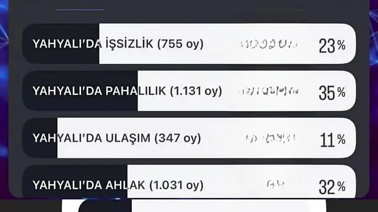 Yahyalı’da hangi sorunların öne çıktığını belirlemek amacıyla Yahyalı Gerçek Gündem tarafından Instagram üzerinden anket gerçekleştirildi. Yaklaşık 3.270 kişinin oy kullandığı anket, ilçe halkının ekonomik ve sosyal konulara dair nabzını tuttu.Pahalılık – Yüzde 35: Hayat şartlarının giderek zorlaşması, ilçede en çok dile getirilen sorun oldu. Ahlak: Toplumsal Değerlerde Bozulma – Yüzde 32: Yoğun bir kesim, toplumsal ilişkilerde ve değerlerde yaşanan bozulmayı ciddi bir problem olarak gördüğünü belirtti. İşsizlik – Yüzde 23: İşsizlik konusu, üçüncü sırada yer aldı. Ulaşım – Yüzde 11: Ulaşımda yaşanan sıkıntılar daha düşük oranda işaret edilse de dikkate değer bir sonuç oluşturdu.