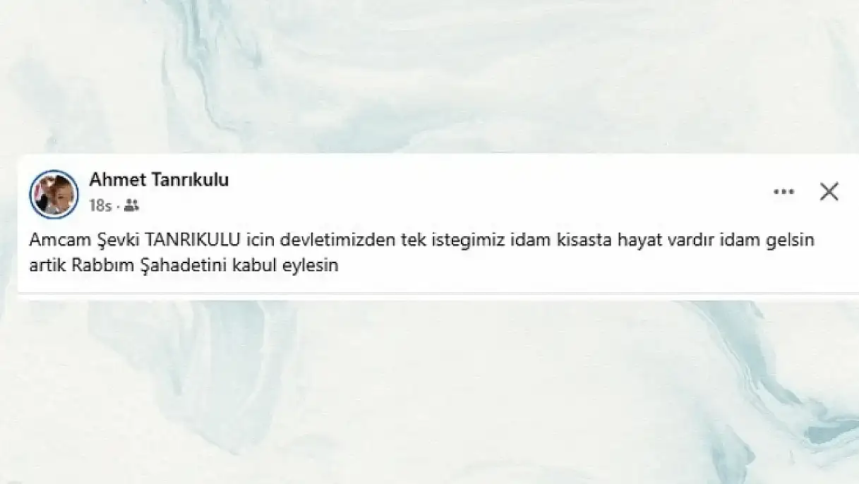Ahmet Tanrıkulu’nun sosyal medyada yaptığı paylaşımda şu ifadelere yer verildi: ‘Amcam Şevki Tanrıkulu için devletimizden tek isteğimiz idam. Kısasta hayat vardır. Bu ülkede camide, namazda bir adam öldürülüyorsa, cezası da en ağır şekilde verilmelidir. İdam gelsin artık. Rabbim şehadetini kabul eylesin.’
