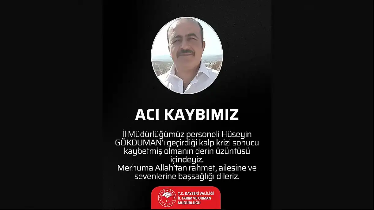 Kayseri İl Tarım ve Orman İl Müdürlüğü kadrosunda görev yapmakta olan Hüseyin Gökduman vefat etti. İl Müdürlüğü tarafından yapılan açıklamada ‘’İl Müdürlüğümüz personeli Hüseyin Gökduman geçirdiği kalp krizi sonucu kaybetmiş olmanın derin üzüntüsü içindeyiz. Merhuma Allah'tan rahmet, ailesine ve sevenlerine başsağlığı dileriz'' ifadeleri kullanıldı.