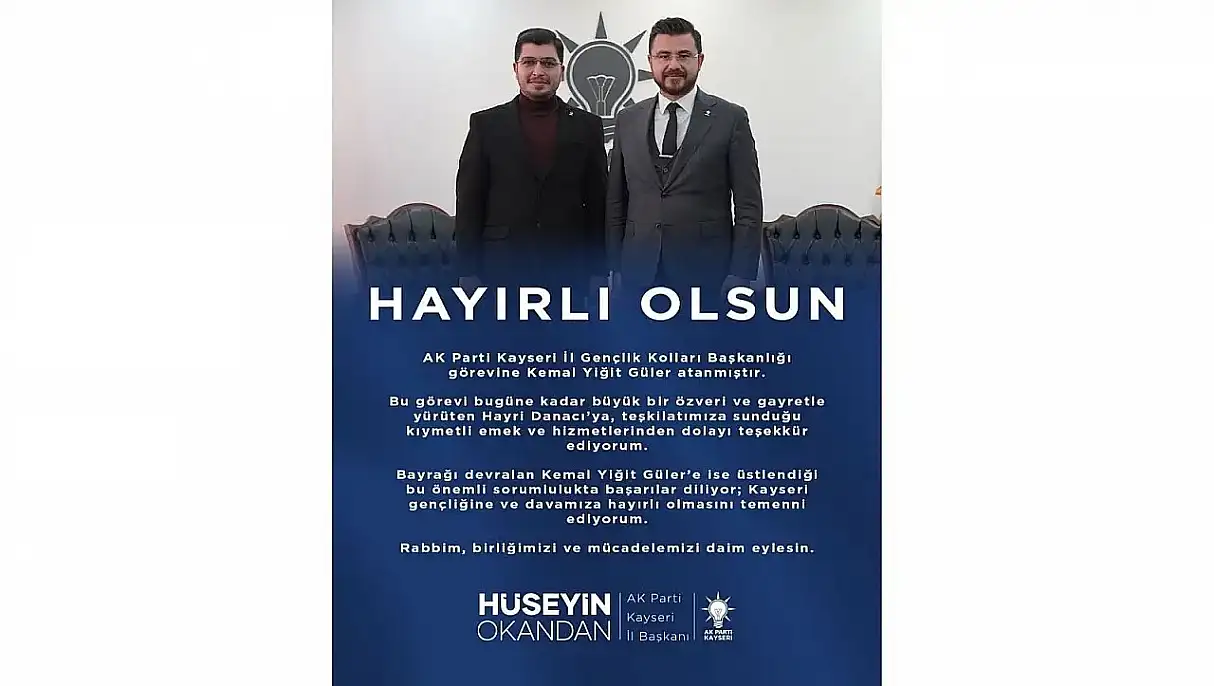 Okandan sosyal medya hesabından yaptığı açıklama ile AK Parti Kayseri İl Gençlik Kolları Başkanlığı görevine Kemal Yiğit Güler'in atandığını açıkladı. Eski başkan Hayri Danacı'ya teşekkür eden Okandan, ‘’Bu görevi bugüne kadar büyük bir özveri ve gayretle yürüten Hayri Danacı’ya, teşkilatımıza sunduğu kıymetli emek ve hizmetlerinden dolayı teşekkür ediyorum. Bayrağı devralan Kemal Yiğit Güler’e ise üstlendiği bu önemli sorumlulukta başarılar diliyor; Kayseri gençliğine ve davamıza hayırlı olmasını temenni ediyorum. Rabbim, birliğimizi ve mücadelemizi daim eylesin.'' ifadelerini kullandı.