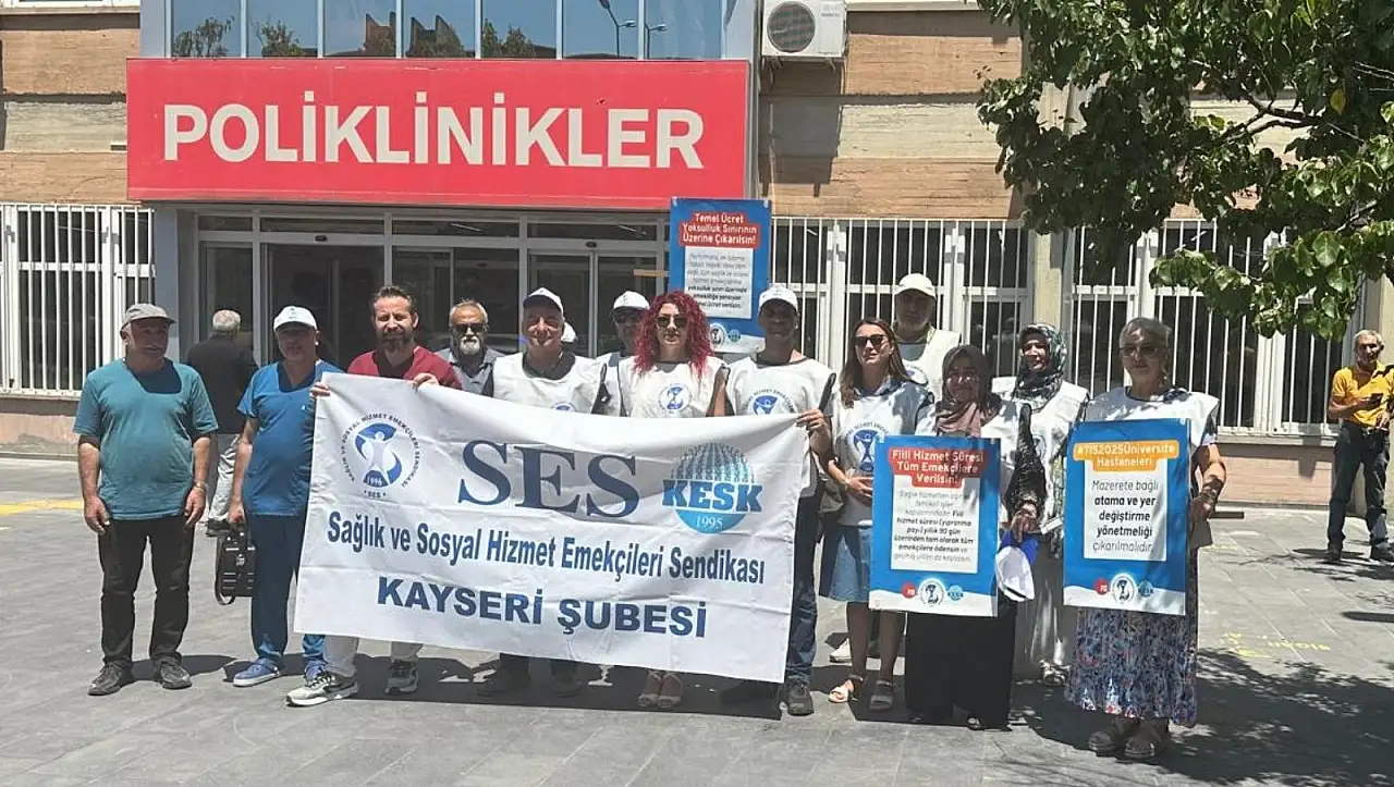 Kayseri’de Sağlık ve Sosyal Hizmet Emekçileri Sendikası (SES) üyeleri 23 Temmuz'da Erciyes Üniversitesinde 2026-2027 yıllarını içerecek toplu sözleşme ile ilgili basın açıklaması düzenledi.