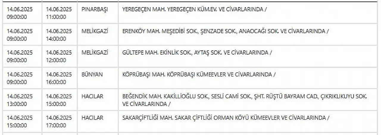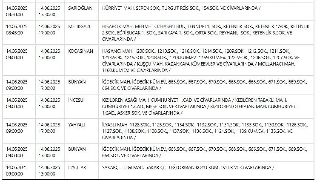 - Kayseri elektrik kesintisi: 14 Haziran 2025 Cumartesi KCETAŞ elektrik kesinti listesi...