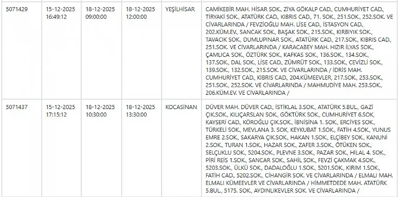 KCETAŞ’tan edinilen bilgilere göre yarın (18 Aralık 2025) aşağıdaki ilçe ve mahallelerde elektrik kesintisi yaşanacak.