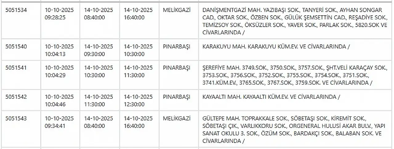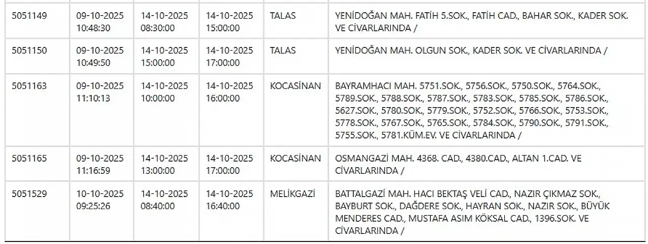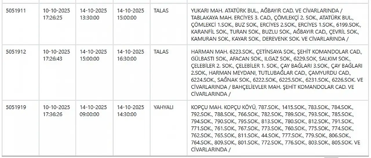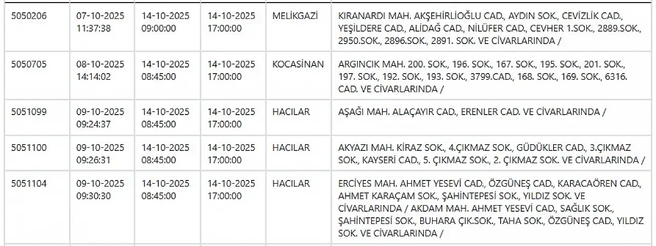 Elektrik kesintilerinin yaşanacağı ilçeler arasında Kayseri’nin Melikgazi, Kocasinan, Talas, Hacılar, Yahyalı gibi en merkezi ve yoğun nüfuslu bölgeleri de yer alıyor.
