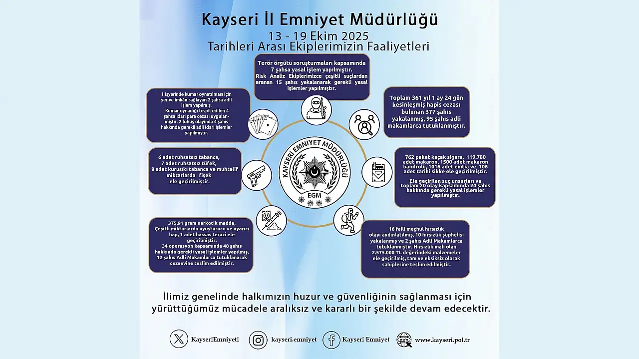 Kayseri İl Emniyet Müdürlüğü tarafından gerçekleştirilen çalışmalar doğrultusunda 13-19 Ekim tarihleri arasında ekipler tarafından çok sayıda operasyon ve denetim faaliyet gerçekleştirildi.