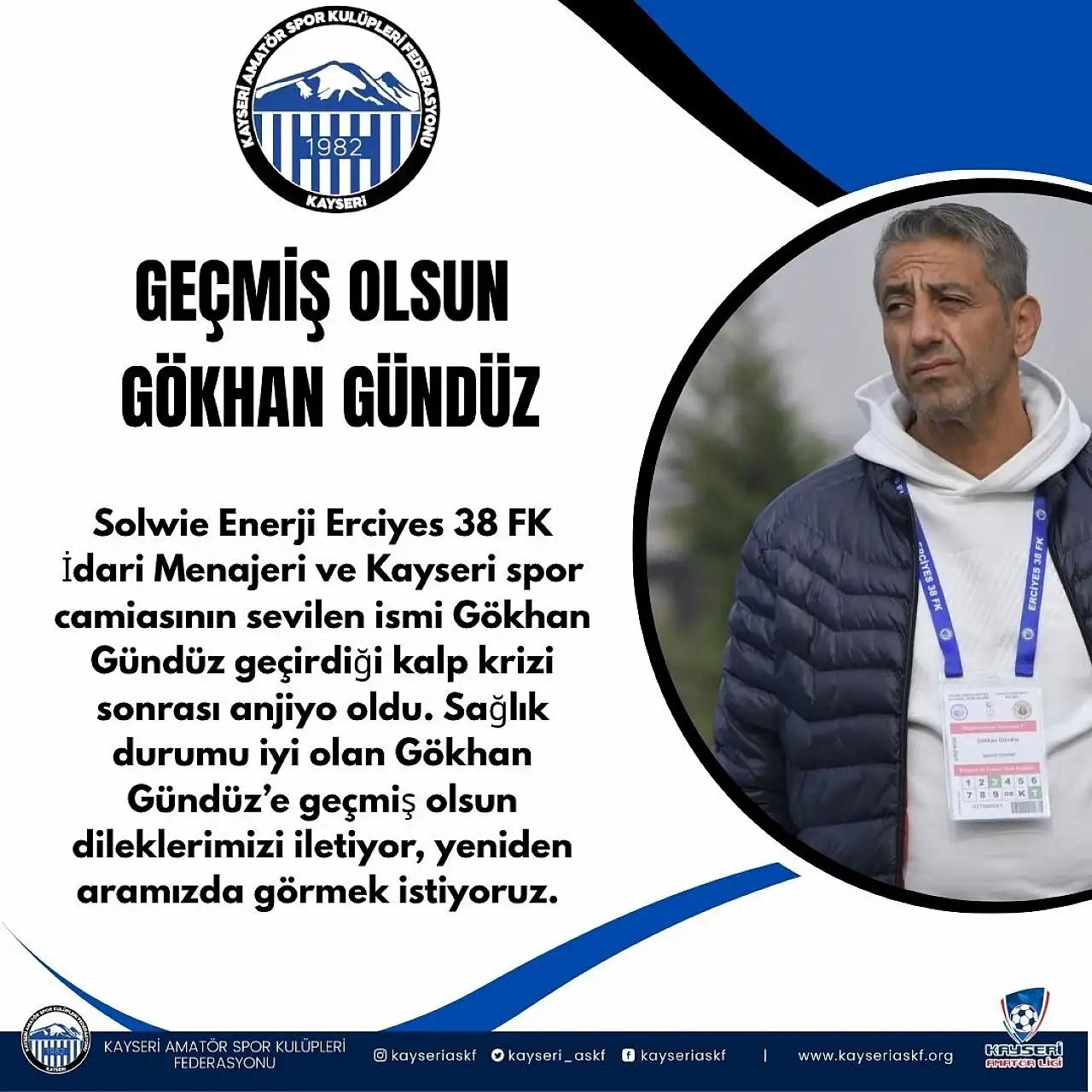 Kayseri ASKF Genel Başkanı ve TFF Kayseri Bölge Müdürü Mutlu Önal, “Geçmiş olsun Gökhan Gündüz” başlığıyla şu ifadeleri kullandı: “Solwe Enerji Erciyes 38 FK İdari Menajeri ve Kayseri spor camiasının sevilen ismi Gökhan Gündüz geçirdiği kalp krizi sonrası anjiyo oldu. Sağlık durumu iyi olan Gökhan Gündüz’e geçmiş olsun dileklerimizi iletiyor, yeniden aramızda görmek istiyoruz.”