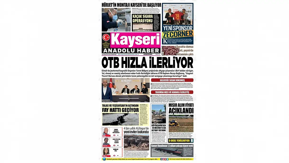 Anadolu Haber manşetinde ‘OTB hızla ilerliyor’ başlığı ile Kayseri Ticaret Borsası Başkanı Recep Bağlamış’ın ifadelerine yer verdi. Elmalı’da jeotermal kaynaklı Organize Tarım Bölgesi projesinde altyapı çalışmalarının dört koldan sürdüğü söylenerek, şehrin tarım potansiyelinin en üst seviyeye çıkarmada kararlı oldukları vurgulandı.