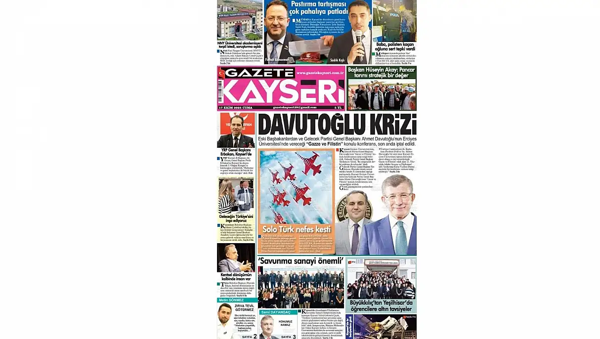 Gazete Kayseri manşetinde ‘Davutoğlu Krizi’ ifadeleri ile Eski başkanlardan ve Gelecek Partisi Genel Başkanı Ahmet Davutoğlu’nun Erciyes Üniversitesi’nde vereceği ‘Gazze ve Filistin’ konulu konferansının son anda iptal edilmesine yer verdi. Gelecek Partisi Genel Başkan Yardımcısı Mustafa Gözel’in sosyal medya hesabından paylaşım yaparak Kayseri Erciyes Üniversitesi’nin konferansa izin vermediğini ifade etmesi ön plana çıkarıldı.