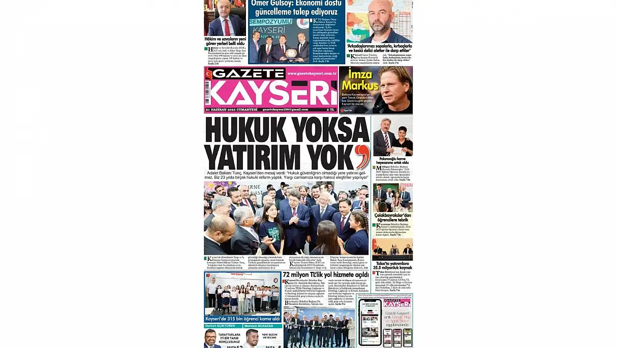 Gazete Kayseri Kayseri’de düzenlenen Yargı ve İş Dünyası Sempozyumu’na katılan Adalet Bakanı Yılmaz Tunç’a manşetinde yer verdi. Adalet Bakanı Tunç’un Kayseri’den verdiği ‘Hukuk güvenliğinin olmadığı yere yatırım gelmez. Biz 23 yılda birçok hukuki reform yaptık. Yargı camiamıza karşı haksız eleştiriler yapılıyor’ mesajı ön plana çıkarıldı.