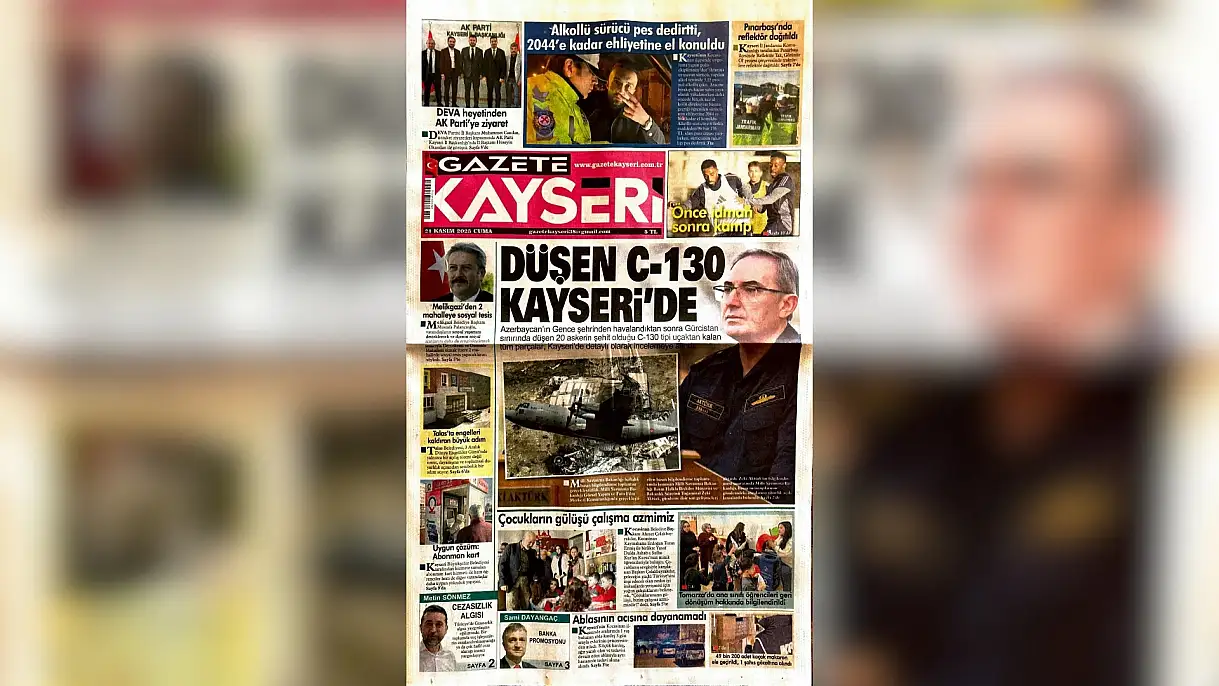 Gazete bugün manşet haberine ‘’Düşen C-130 Kayseri'de'' başlığı ile çıktı. 11 Kasım'da Azerbaycan dönüşü düşerek 20 askerimizin şehit olduğu kazaya neden olan uçağın düşüş nedeni Kayseri'de yapılacak olan incelemenin ardından belli olacak.