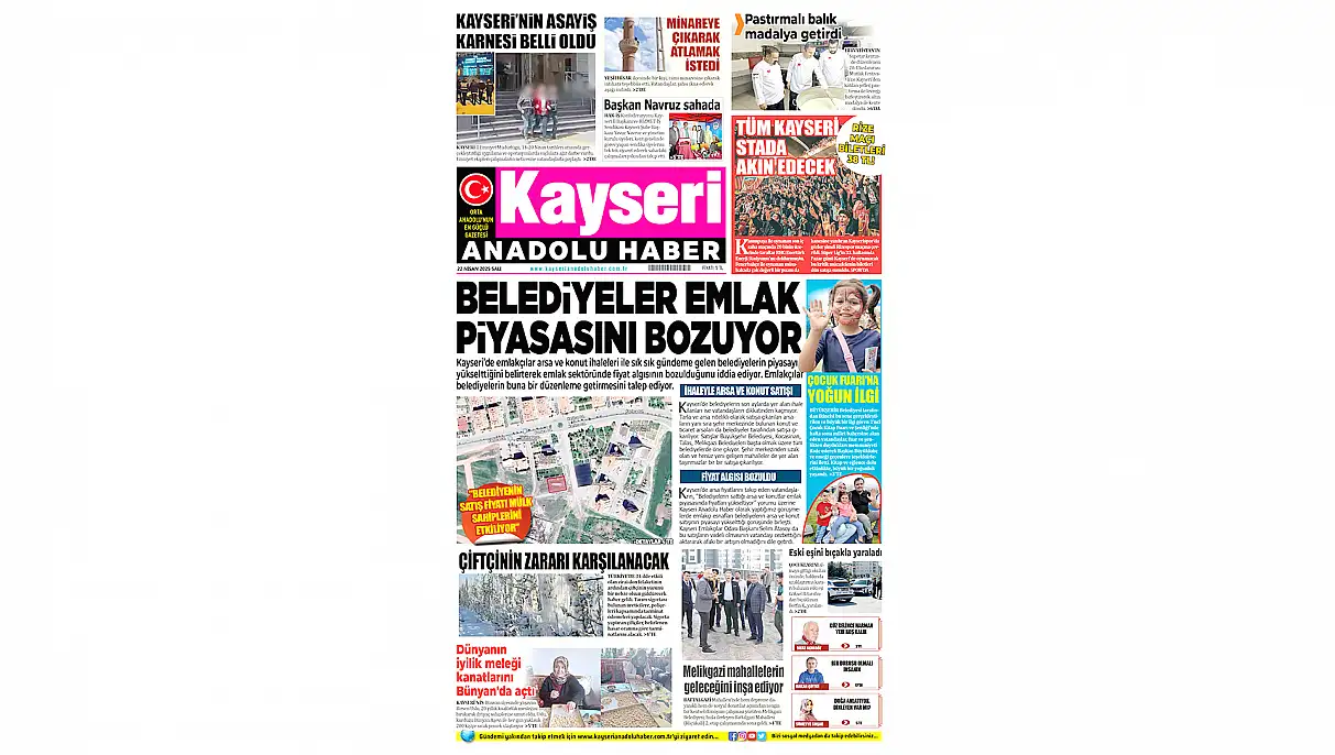 Anadolu Haber manşetinde emlak piyasasında yaşanan sorunları dile getirdi. ‘Belediyeler emlak piyasasını bozuyor’ başlığı ile gündeme getirilen haberde, ‘Belediyelerin sattığı arsa ve konutlar emlak piyasasında fiyatları yükseltiyor’ yorumu üzerine Kayseri’de bulunan emlakçılar ve Kayseri Emlakçılar Odası Başkanı Selim Atasoy’dan görüş alındı. Anadolu Haber ekibi, emlakçı esnafları belediyelerin arsa ve konut satışının piyasayı yükselttiği görüşünde birleşirken, Kayseri Emlakçılar Odası Başkanı Selim Atasoy da bu satışların vadeli olmasının vatandaşı cezbettiğini aktararak afaki bir artışın olmadığını ifade ettiğini aktardı.