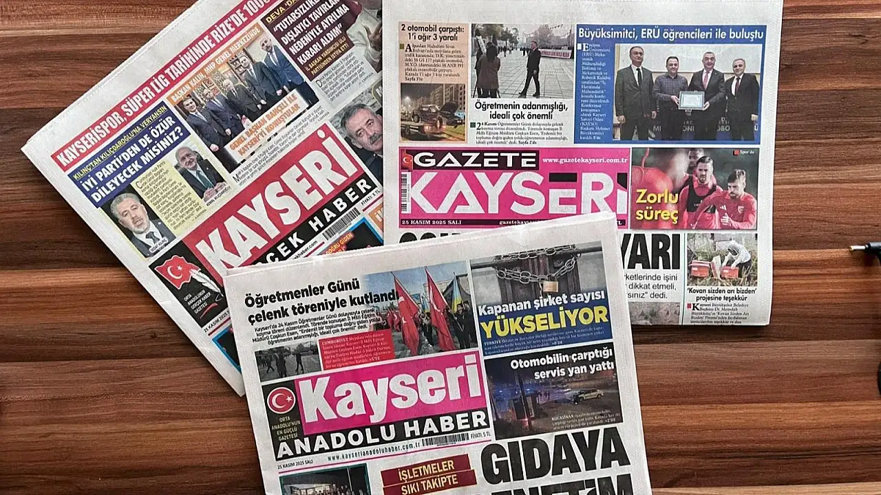 Kayseri'de Basın İlan Kurumu'na bağlı 3 yerel gazete şehrin 25 Kasım 2025 gündemini belirledi. Kayseri Anadolu Haber, Gazete Kayseri ve Kayseri Gerçek Haber gazetelerinin öne çıkan manşet haberlerini sizler için derledik. Detaylar haberimizde…