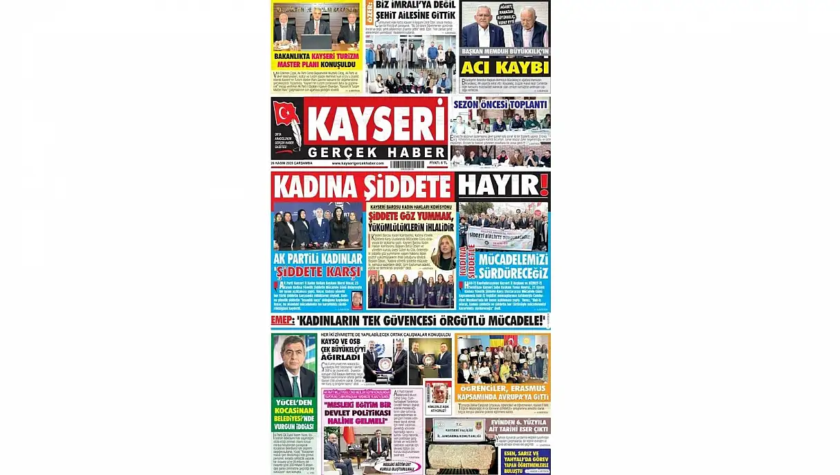 Gerçek Haber manşetinde ‘Kadına Şiddete Hayır’ başlığı ile 25 Kasım Kadına Yönelik Şiddetle Mücadele Günü dolayısıyla gerçekleşen programlara yer verdi. AK Parti İl Kadın Kolları Başkanı Meral Koşar düzenlediği basın açıklamasında kadına yönelik şiddetin karşısında olduklarını ifade ederek, mücadelenin kararlılıkla sürdürüleceğini kaydetti. Kayseri Barosu Kadın Komisyonu önlenebilir şiddete göz yummanın yaşam hakkına ilişkin pozitif yükümlülüklerin ihlali olduğunu kaydetti.