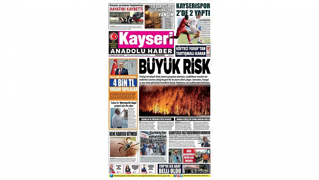 Anadolu Haber manşetinde, Türkiye’nin birçok ilinde çıkan orman yangınlarını ‘Büyük risk’ başlığı ile verdi. Kayseri’de de alarm zillerinin çaldığını ifade eden Anadolu Haber, uzmanların mangal ve anız ateşi gibi küçük ihmallerin büyük felaketlere yol açabileceğini belirttiğini ifade etti.