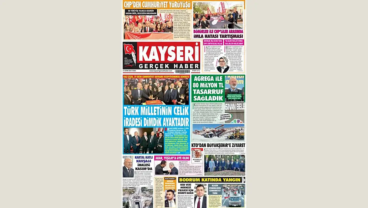 Kayseri’de kutlanan 29 Ekim Cumhuriyet Resepsiyonu’nda Vali Gökmen Çiçek’in açıklamaları Gerçek Haber Gazetesi’nde ‘Türk Milletinin Çelik İradesi Dimdik Ayaktadır’ başlığıyla manşet haber olarak yer aldı. Gazetenin bir diğer manşeti ise ’Agrega ile 80 milyon TL Tasarruf Sağladık’ oldu.