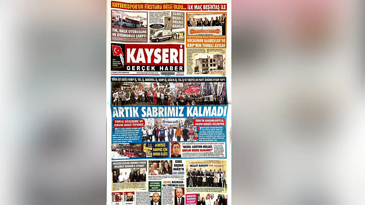Kayseri Gerçek Haber Gazetesi bugün manşetine kamu işçilerini zam talebine ilişkin yaptıkları eylemleri taşıdı. TÜRK-İŞ ‘e bağlı sendikaların yaptıkları eylemler ve işçilerin talepleri gazetenin bugün ki manşette geniş yer buldu. ’Artık Sabrımız Kalmadı' ifadesi kullanıldı.