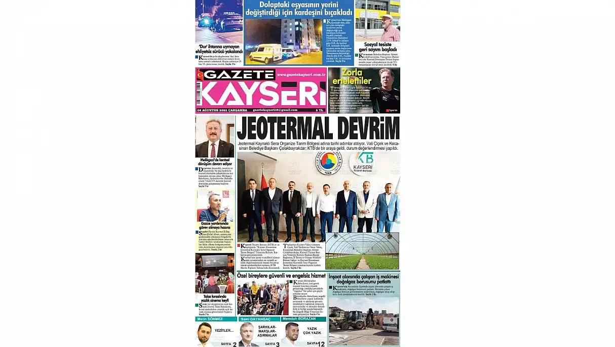 Gazete Kayseri manşetinde 'Jeotermal devrim’ başlığı ile Kayseri Ticaret Borsası’nda (KTB) yapılan toplantıya yer verdi. Jeotermal Kaynaklı Sera Organize Tarım Bölgesi adına tarihi adımların atıldığını ifade eden Gazete Kayseri, Vali Gökmen Çiçek ve Kocasinan Belediye Başkanı Ahmet Çolakbayrakdar’ın KTB’de bir araya geldiğini ve durum değerlendirmesi yapıldığını belirtti.