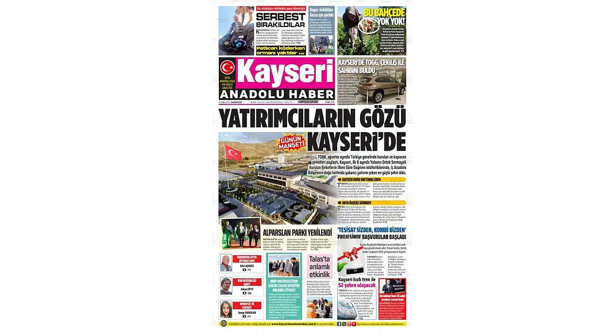 Anadolu Haber manşetinde ‘Yatırımcıların gözü Kayseri’de' başlığı ile TOBB tarafından Ağustos ayında Türkiye genelinde kurulan ve kapanan şirketlere yer verdi. Kayseri ilk 8 ayında Yabancı Ortaklı Sermayeli kurulan şirketlerin illere göre dağılım istatistiklerinde İç Anadolu Bölgesinin doğu hattında yabancı yatırım çeken en güçlü şehri oldu.