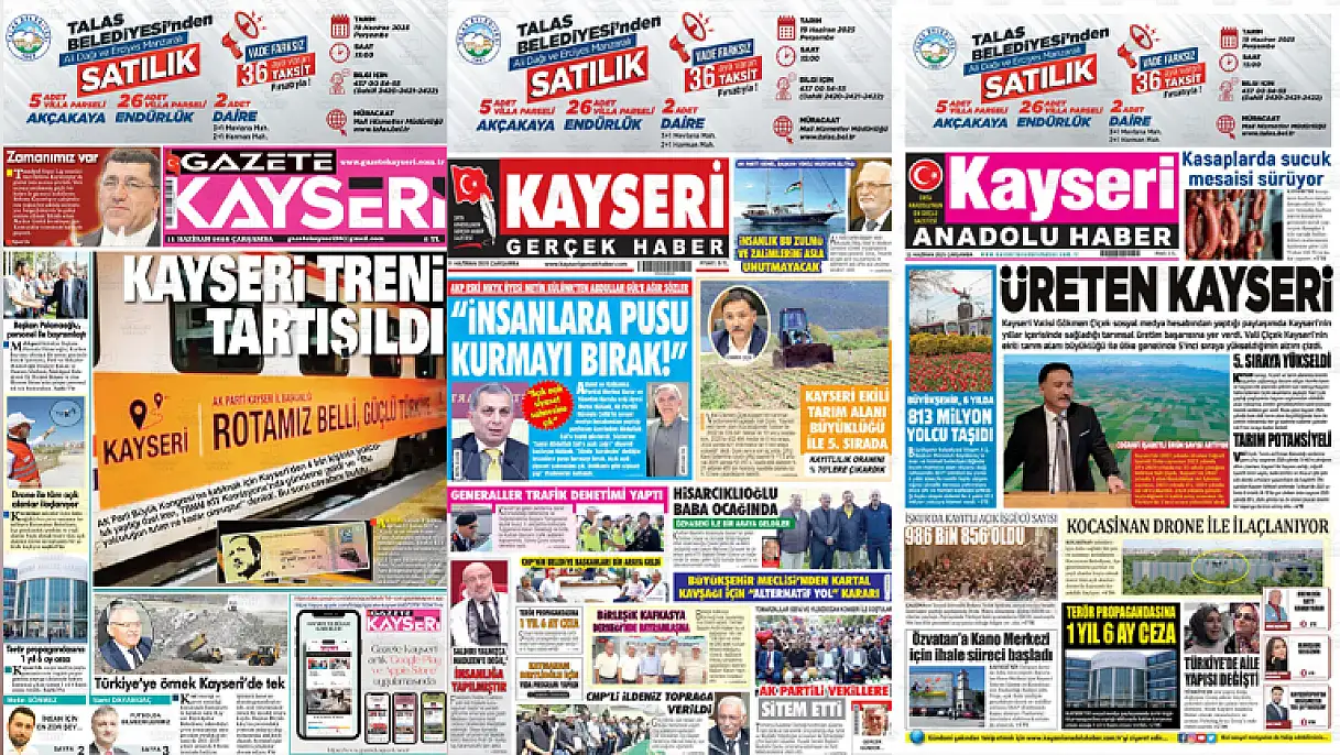 Kayseri’de Basın İlan Kurumu’na bağlı olarak öne çıkan Kayseri Gerçek Haber, Kayseri Anadolu Haber, ve Gazete Kayseri yerel basınının 11 Haziran Çarşamba günü öne çıkan manşetlerinin detaylarına sizler için yer verdik.