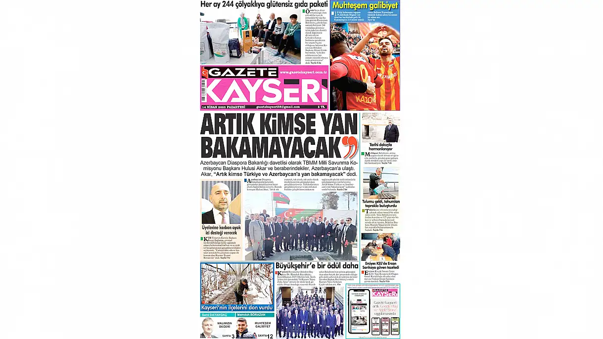 Gazete Kayseri ise manşetinde Azerbaycan Diaspora Bakanlığı davetlisi olan TBMM Milli Savunma Komisyonu Başkanı Hulusi Akar’ın konuşmaları manşette yer aldı. Azerbaycan’da konuşma yapan Hulusi Akar’ın ‘Artık kimse Türkiye ve Azerbaycan’a yan bakamayacak’ sözleri ön plana çıkartıldı.