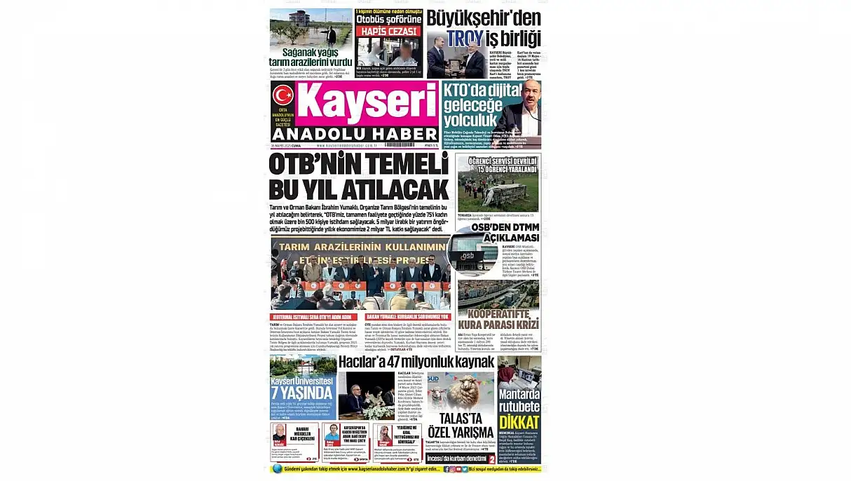 Anadolu Haber’in manşetinde de ‘OTB’nin temeli bu yıl atılacak’ başlığı ile Tarım ve Orman Bakanı İbrahim Yumaklı’nın Kayseri ziyareti yer aldı. Bakan Yumaklı Organize Tarım Bölgesi’nin (OTB) bu sene atılacağını belirterek ‘OTB’miz, tamamen faaliyete geçtiğinde yüzde 75’i kadın olmak üzere bin 500 kişiye istihdam sağlayacak.5 milyar liralık bir yatırım öngördüğümüz proje bittiğinde yıllık ekonomimize 2 milyar TL katkı sağlayacak’ ifadelerinde bulundu.