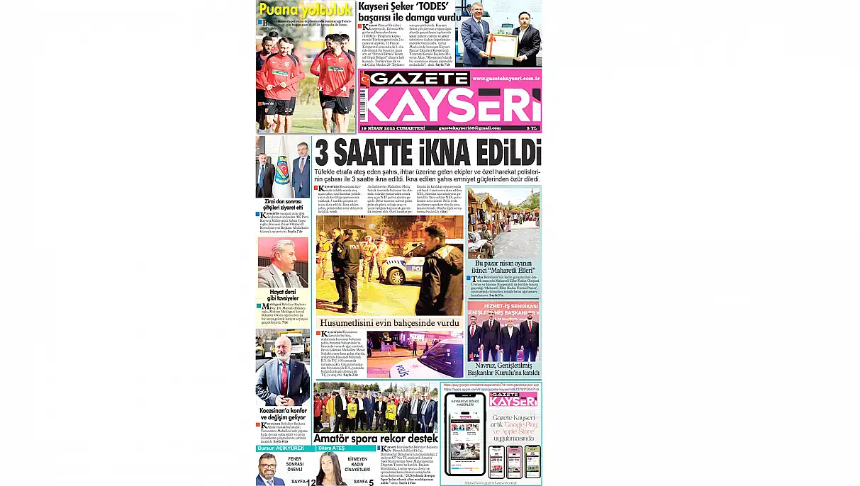 Gazete Kayseri’nin manşetinde Kocasinan ilçesinde tüfekle etrafa ateş eden şahsın 3 saatte ikna edildiğine yer verildi. Tüfekle etrafa ateş eden şahsın, ihbar üzerine gelen ekipler ve özel hareket polisinin çabası ile ikna edildiği ve emniyet güçlerinden dilediği özür ön plana çıkartıldı.