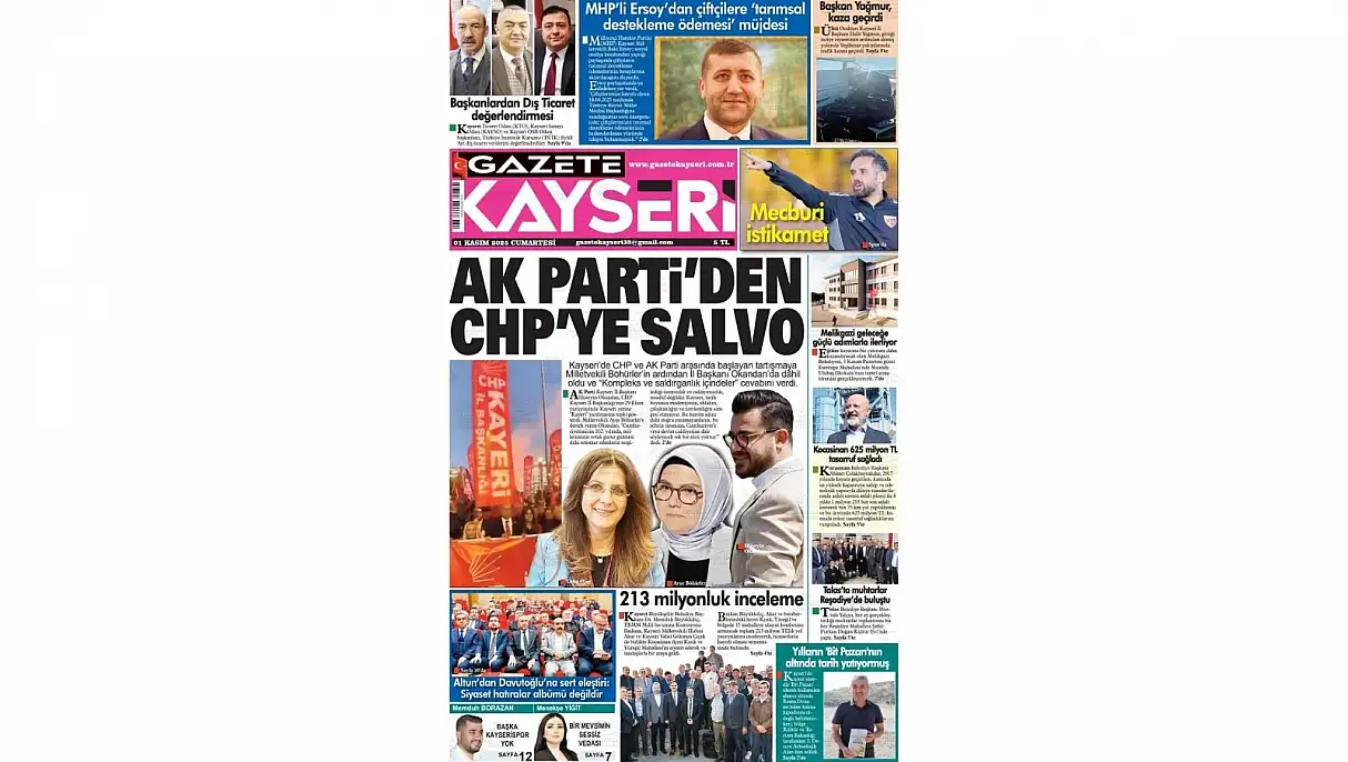 Gazete Kayseri manşetinde ‘AK Parti’den CHP’ye Salvo’ başlığı ile CHP-AK Parti tartışmalarına yer verdi. Kayseri’de CHP ve AK Parti arasında başlayan tartışmaya Milletvekili Böhürler’in ardından İl Başkanı Okandan’da dahil oldu ve ‘Kompleks ve saldırganlık içindeler’ cevabını verdi.
