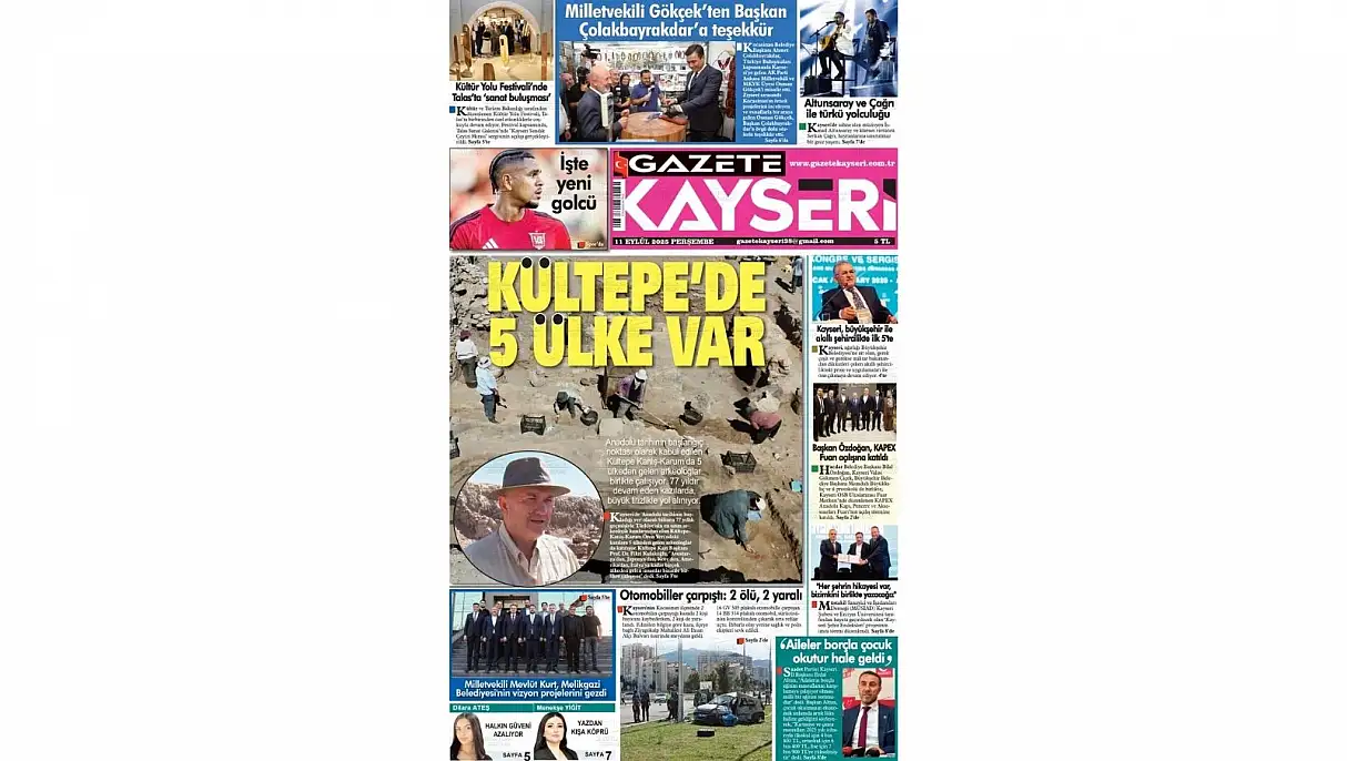Gazete Kayseri manşetinde ‘Kültepe’de 5 ülke var’ başlığı ile Kültepe’de yapılan çalışmalara yer verdi. Anadolu tarihinin başlangıç noktası kabul edilen Kültepe Kaniş-Karum’da 5 ülkeden gelen arkeologlar birlikte çalışıyor. 77 yıldır devam eden kazılarda büyük titizlikle yol alınıyor.