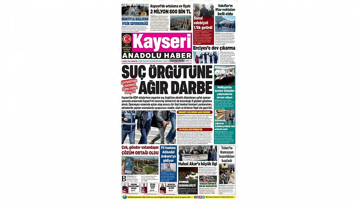 - Kayseri Gazetelerinde 14 Şubat Cumartesi günü manşet tek: Suç örgütüne büyük baskın!