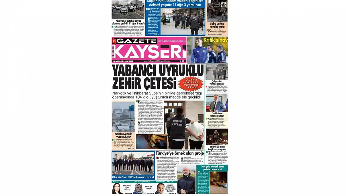 Gazete Kayseri manşetinde ‘Yabancı Uyruklu Zehir Çetesi’ başlığı ile kentte gerçekleşen operasyona yer verdi. Narkotik ve İstihbarat Şube’nin birlikte gerçekleştirdiği operasyonda 104 kilo uyuşturucu madde ele geçirildi.