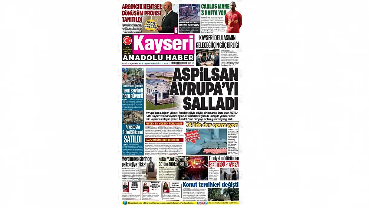 Kayseri yerel basında 17 Eylül Çarşamba günü gazetelerde yer alan manşetleri sizler için derledik. Kayseri Gerçek Haber ve Gazete Kayseri Argıncık Mahallesi kentsel dönüşüm projesi basın toplantısına, Kayseri Anadolu Haber ise ASPİLSAN'ın başarısına yer verdi. Detaylar Kayseri Anadolu Haber'in Kayseri haberinde…