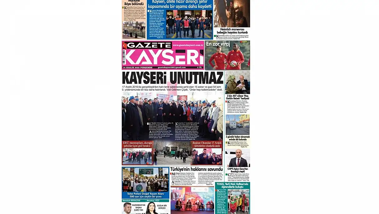 Gazete Kayseri manşetinde ‘Kayseri Unutmaz’ başlığı ile 17 Aralık Şehitleri anma törenine yer verdi. 17 Aralık 2016’da gerçekleştirilen hain terör saldırısında şehit düşen 15 asker ve gazi 54 isim 9. Yıl dönümünde bir kez daha hatırlandı. Kayseri Valisi Gökmen Çiçek anma töreninde yaptığı konuşmasında ‘Onlar hep kalbimizdedir’ dedi.