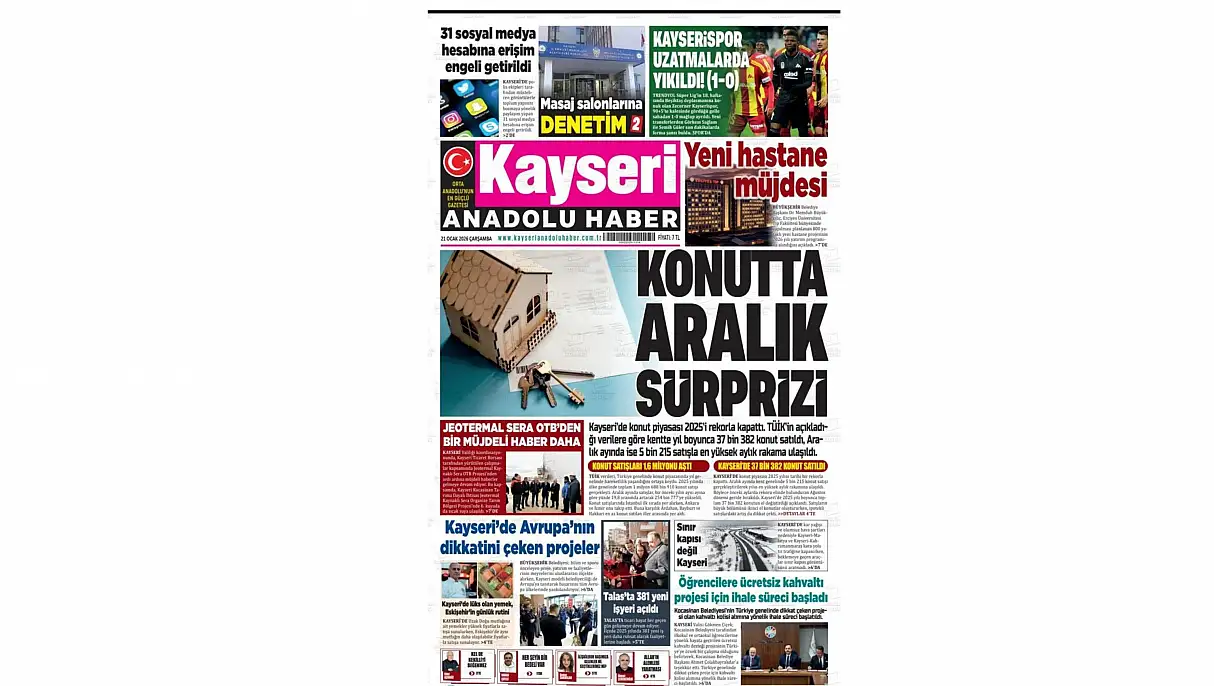 Anadolu Haber manşetinde ‘Konutta Aralık Sürprizi’ başlığı ile konut piyasasına yer verdi. 2025 yılını konut piyasası Kayseri’de rekorla kapattı. TÜİK’in açıkladığı verilere göre kentte yıl boyunca 37 bin 382 konut satıldı. Aralık ayında ise 5 bin 215 satışla en yüksek aylık rakama ulaşıldı.