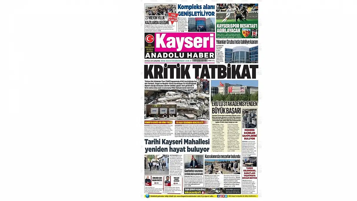 Anadolu Haber manşetinde ‘Kritik tatbikat’ başlığı ile yine kentte gerçekleştirilen tatbikata yer verdi. Türkiye Afet Müdahale Planı (TAMP) kapsamında AFAD öncülüğünde Kayseri merkezli Yozgat ve Nevşehir illerini de etkileyen 6,4 büyüklüğünde deprem olacağı senaryosu üzerine tatbikat yapıldı. Kent genelinde 11 farklı nokta enkaz alanı ve ana kamp alanı Millet Bahçesi olarak belirlendi.
