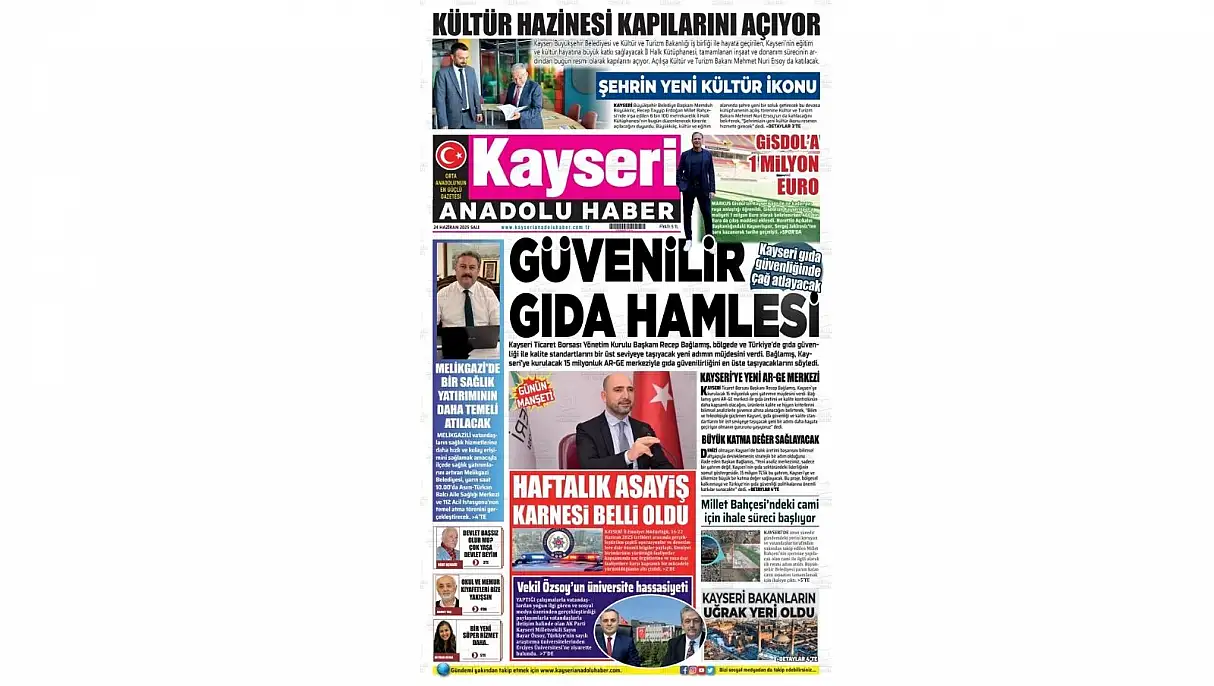 Anadolu Haber manşetinde ‘Güvenilir Gıda Hamlesi’ başlığı ile Kayseri Ticaret Borsası’nın Kayseri’ye kuracağı 15 milyonluk AR-GE merkezine yer verdi. Kayseri’ye gıda güvenliğinde çağ atlatacak projenin detayları haberde verilirken, Kayseri Ticaret Borsası Başkanı Recep Bağlamış’ın ‘Yeni analiz merkezimiz sadece bir yatırım değil aynı zamanda Kayseri’nin gıda sektöründe liderliğinin somut göstergesidir’ ifadeleri ön plana çıkarıldı.