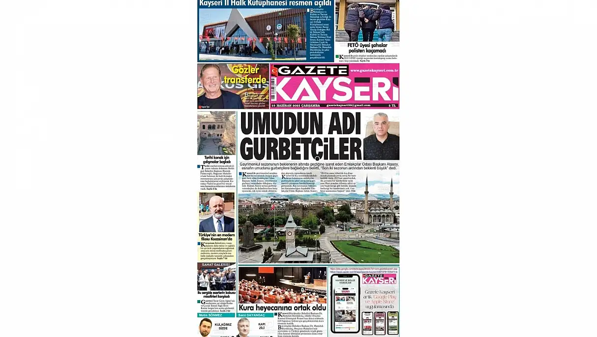 Gazete Kayseri manşetinde ‘Umudun adı gurbetçiler’ başlığı ile Emlakçılar Odası Başkanı Selim Atasoy’un açıklamalarına yer verdi. Gayrimenkul sektöründe sezonun beklenenin altında geçtiğini ifade eden Atasoy, esnafın umudunu gurbetçilere bağladığını belirterek, ‘Son iki sezonun ardından beklenti büyük’ ifadelerinde bulundu.