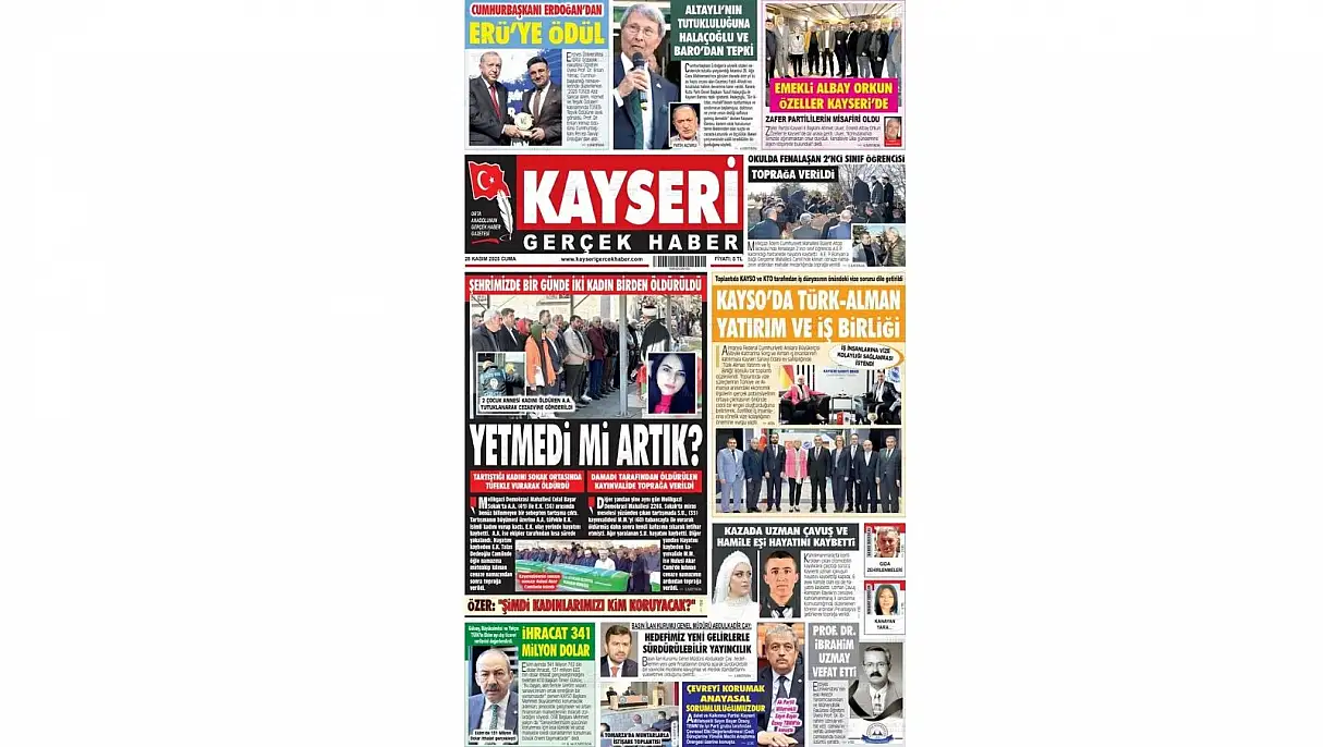 Gerçek Haber manşetinde ‘Yetmedi Mi Artık?’ başlığı ile kadın cinayetlerine yer verdi. Kayseri’de bir günde iki kadın birden öldürüldü. Melikgazi’de tartıştığı kadını sokak ortasında tüfekle vuran şahıs tutuklanırken, damadı tarafından öldürülen kayınvalide toprağa verildi.