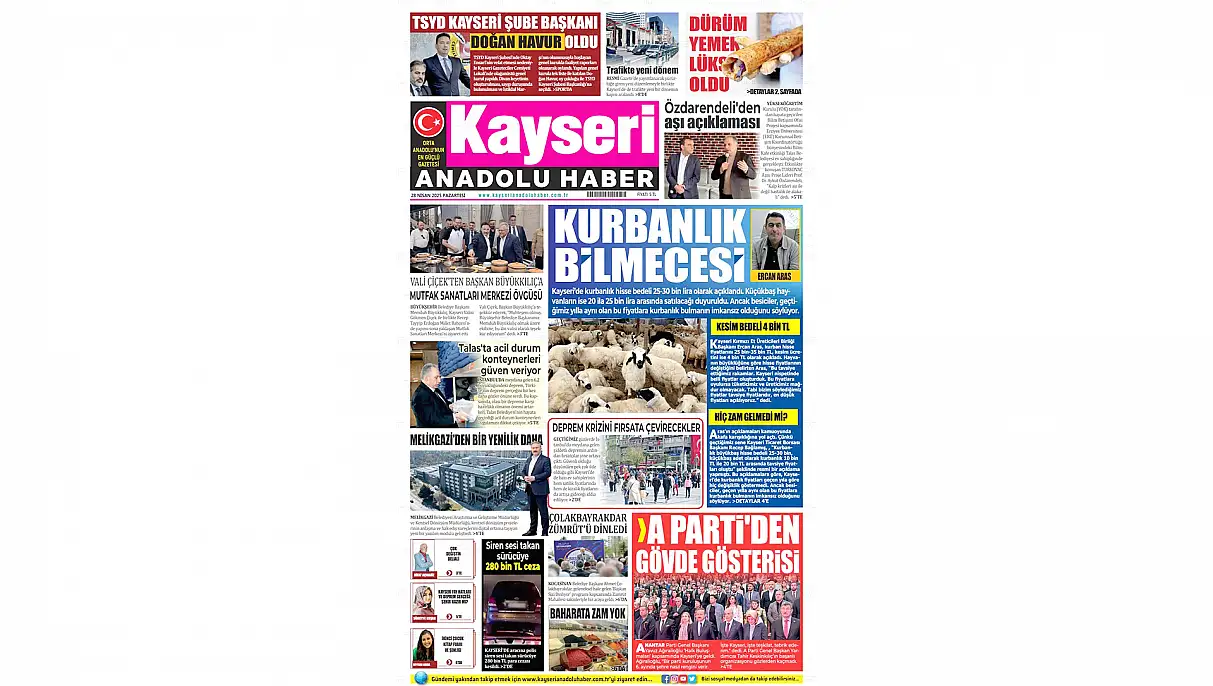 Anadolu Haber’in manşetinde ‘Kurbanlık Bilmecesi’ başlığı altında Kayseri Kırmızı Et Üreticileri Birliği Başkanı Ercan Aras’ın kurbanlık hisse bedeli açıklamasına yer verdi. Kayseri’de kurbanlık hisse bedeli 25-30 bin lira olarak açıklandı. Manşette ‘Hiç zam gelmedi mi?’ vurgusu yapılırak, geçtiğimiz sene Kayseri Ticaret Borsası Başkanı Recep Bağlamış’ın açıklamalarına yer verildi. Bağlamış: ‘Kurbanlık büyükbaş hisse bedeli 25-30 bin küçükbaş adet olarak 10-20 bin TL arasında’ şeklinde bir açıklama yapmıştı. Bu fiyatlara göre Kayseri’de geçen yıla göre bir fiyat değişikliği olmadığı belirtildi.