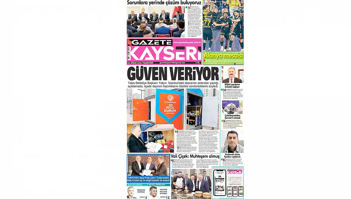 Gazete Kayseri’nin manşetinde ‘Güven veriyor’ başlığı ile Talas Belediye Başkanı Mustafa Yalçın’ın İstanbul depremi ardından yaptığı açıklamada ‘İlçede deprem hazırlıkları titizlikler sürüyor’ ifadeleri vurgulandı. Talas Belediyesi olarak ilçenin farklı noktalarına yerleştirilen acil durum konteynerleri ile muhtemel bir sarsıntıda insanların ilk etapta ihtiyaç duyduğu tüm malzemeler temin edilecek.