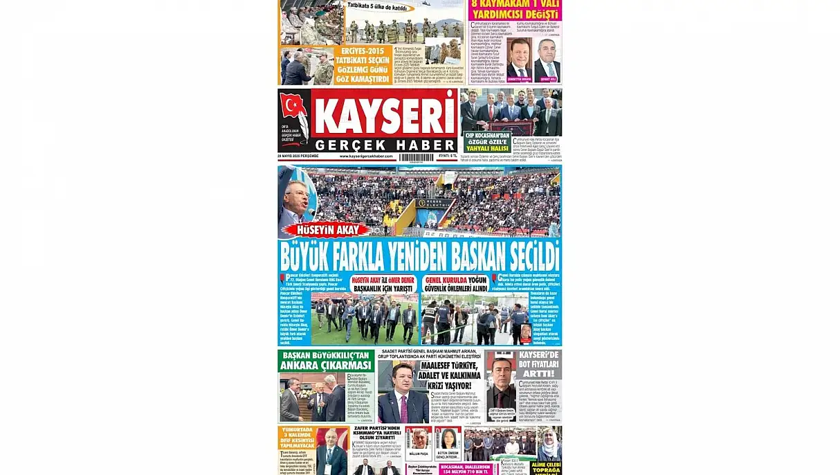 Gerçek haber manşetinde iki gazeteden farklı olarak Kayseri Şeker Kooperatifi seçimine yer verdi. ‘Büyük farkla yeniden başkan seçildi’ başlığı ile sunulan haberde Genel Kurulda Hüseyin Akay’ın rakibi Ömer Demir’e fark atarak yeniden başkan seçilmesi ön plana çıkarıldı.