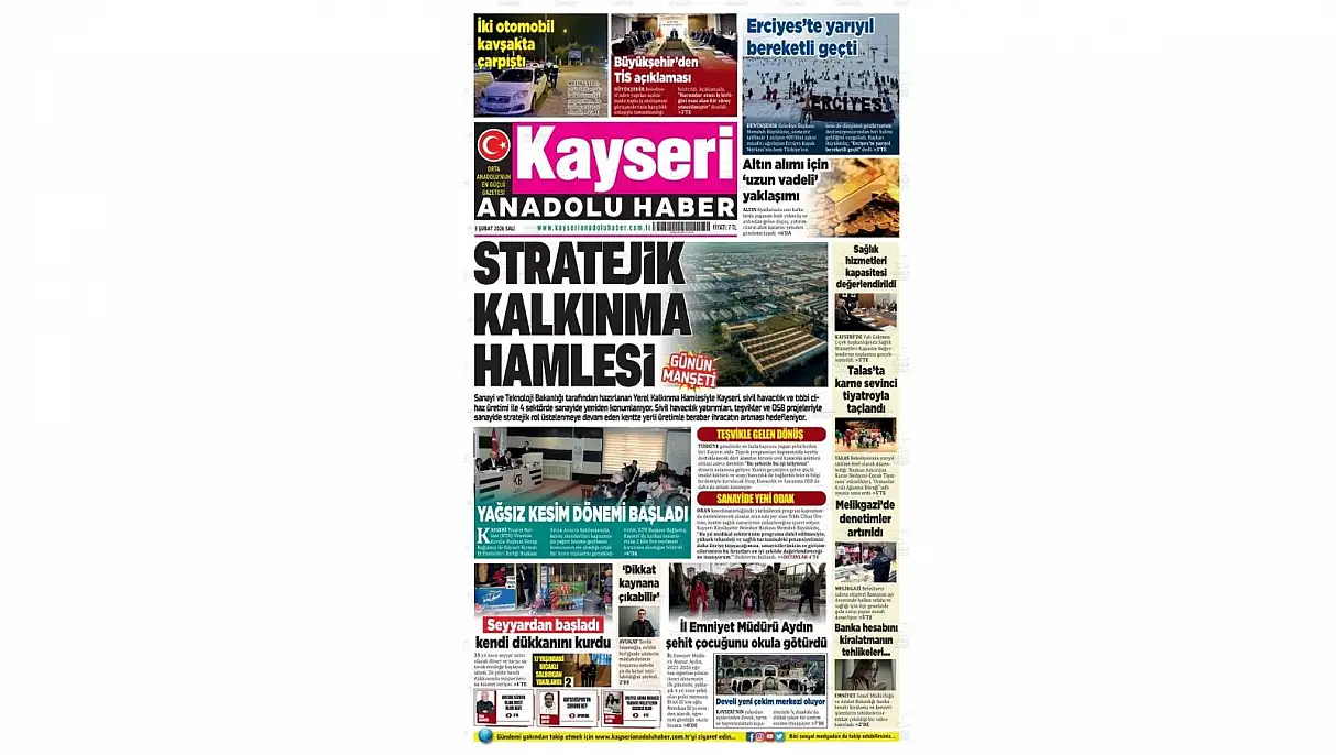 Anadolu Haber manşetinde ‘Stratejik Kalkınma Hamlesi’ başlığı ile Kayseri’nin yerel kalkınma hamlesine yer verdi. Sanayi ve Teknoloji Bakanlığı tarafından hazırlanan Yerel Kalkınma Hamlesiyle Kayseri, sivil havacılık ve tıbbi cihaz üretimi ile 4 sektörde sanayide yeniden konumlanıyor. Sivil havacılık yatırımları, teşvikler ve OSB projeleriyle sanayide stratejik rol üstlenmeye devam eden kentte yerli üretimle beraber ihracatın artması hedefleniyor.