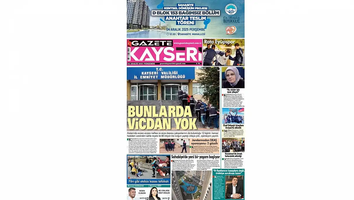 Gazete Kayseri’de Anadolu Haber gibi usulsüz ilaç skandalına ‘Bunlarda Vicdan Yok’ başlığı ile yer verdi. Aralarında eczacı-eczacı kalfası ve ecza deposu çalışanlarının da bulunduğu 12 kişinin kanser hastaları üzerinden sahte reçete ile 88 milyon lira vurgun yaptığı ortaya çıktı.