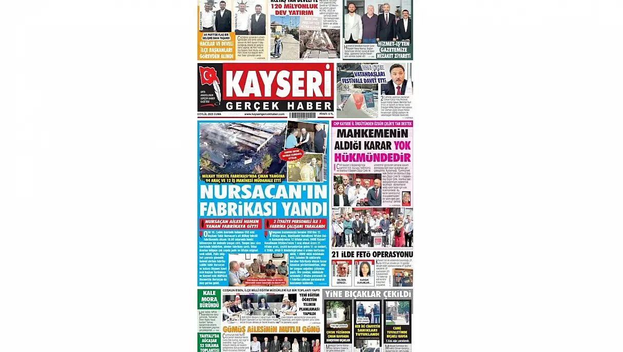 Kayseri yerel basında 5 Eylül Cuma günü gazetelerde yer alan manşetleri sizler için derledik. Kayseri Gerçek Haber ve Kayseri Anadolu Haber manşetinde bugün Kayseri OSB'de çıkan fabrika yangınına yer verirken, Gazete Kayseri AK Parti Kayseri Milletvekili Şaban Çopuroğlu'nun açıklamalarına dikkat çekti. Detaylar Kayseri Anadolu Haber'in Kayseri haberinde…