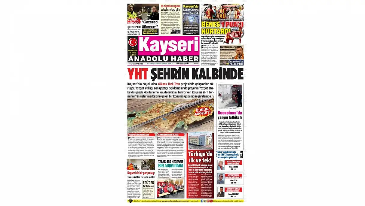 Anadolu Haber manşetinde ‘YHT Şehrin Kalbinde’ başlığı ile Kayseri’nin hayali olan Yüksek Hızlı Tren projesine yer verdi. Yozgat Valiliği son yaptığı açıklamasında projenin Yozgat etabında yüzde 45 ilerleme kaydedildiğini belirtirken Kayseri YHT Terminali’nin şehrin merkezine yakın bir konuma yapılması gündemde.