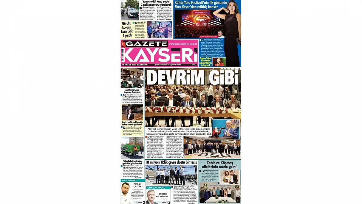 Gazete Kayseri manşetinde ‘Devrim gibi’ başlığı ile OSB’lerde güneş enerjisi kullanımı adına çıkan kanuna yer verdi. AK Parti Genel Başkan Vekili Mustafa Elitaş’ın ‘Sanayicilerimiz adına devrim gibi bir tutum sergiledik’ ifadeleri ön plana çıkarıldı. Elitaş’ın ayrıca ‘Türkiye’de ilk defa Kayseri organize sanayi bölgesi dağıtım bedeli ödemeden elektrik alan organize sanayi bölgesi haline geldi’ ifadelerine yer verildi.