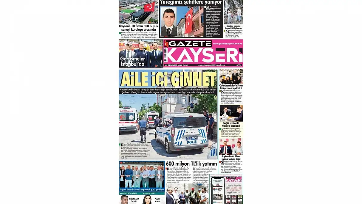 Gazete Kayseri ‘Aile içi cinnet’ başlığı ile kentte yaşanan acı olaya yer verdi. Cinnet geçiren baba hayatını kaybederken, genç kız hastanede yaşam savaşı veriyor. Gazete Kayseri ‘Yüreğimiz şehitlere yanıyor’ başlığı ile ilk sayfada şehidimiz Ümit Üzüm’e yer verdi.