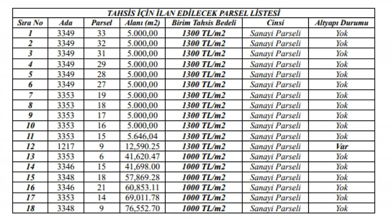 Alanda bazı parseller 5 bin metrekare gibi küçük ama kullanılabilir parseller yer alıyor. Bu tarz arsalar KOBİ yatırımcıları için adeta biçilmiş kaftan olarak değerlendiriliyor. Bazı parseller ise 70 bin metrekareden fazla alana sahip. Büyük üretim tesisleri kurmak isteyenlerin önüne ise bu arsa seriliyor. Arsa tahsis ilanına ulaşmak için tıklayın...